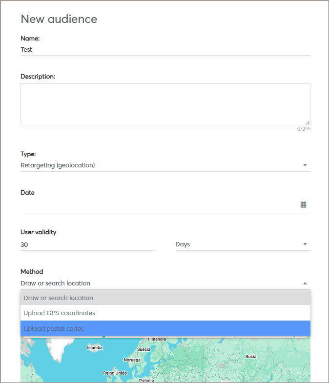 Geolocation is the process of determining a user's or computing device's geographic location using a number of data collection techniques. Eskimi determines the geographic location based on the GPS coordinates while supporting 3 geolocation audience creation methods: simply drawing or searching for the location, uploading GPS coordinates, or postal codes.