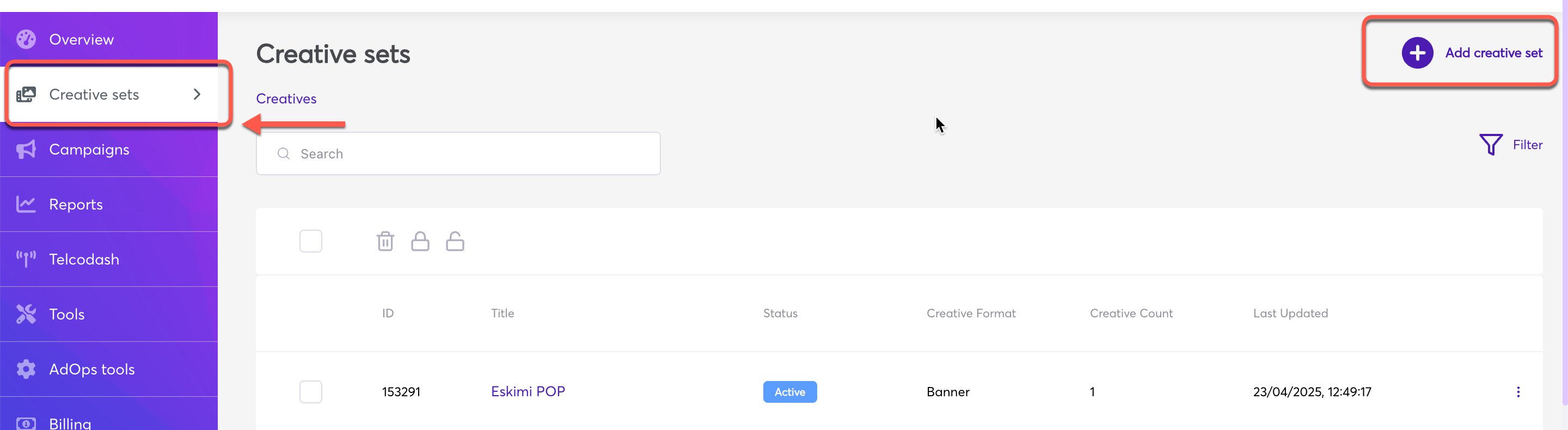 Log in to your DSP account > Go to "Creative Sets" > on the new page click "Add creative set".