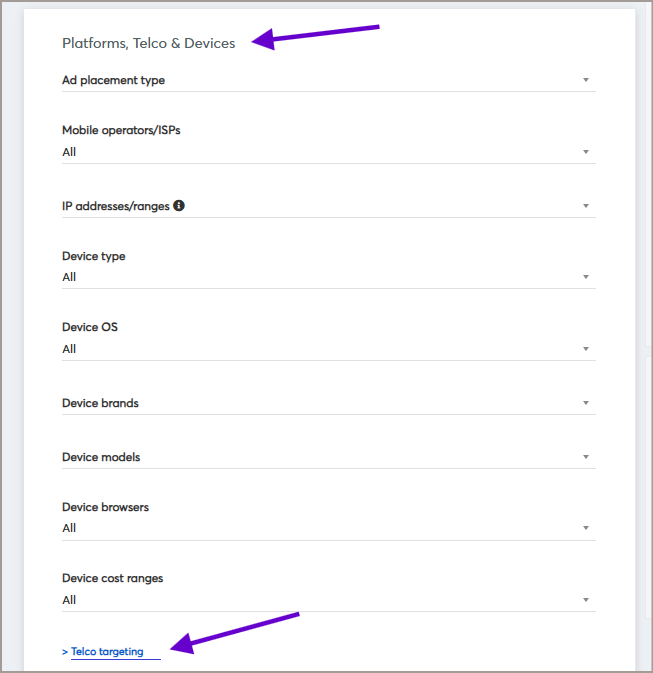SIM amount targeting, which can be found under Advanced telecom targeting, allows brands to target users who were browsing online with 1, 2, 3, or 4 SIM cards for the last 30 days.